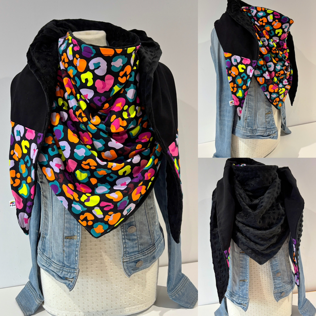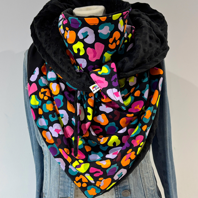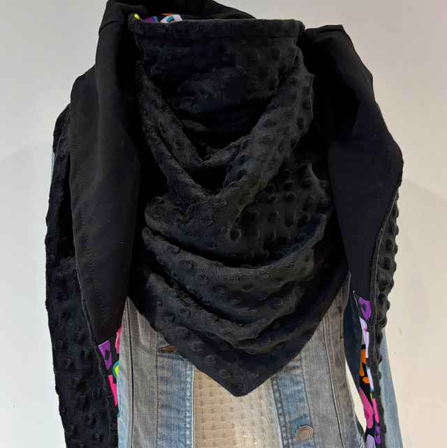 Maxi chèche, châle , écharpe multicolore et noire doublée en polaire minky noire "Happy Zoya
