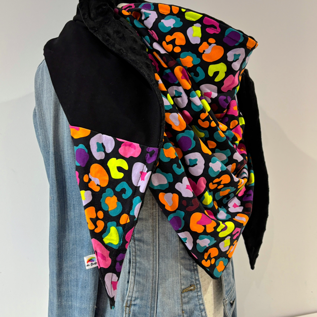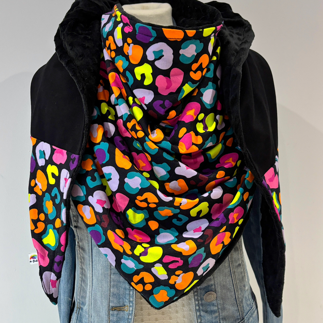 Maxi chèche avec un magnifique tissu avec des taches léopard multicolores sur fond noire en matière sweat et un tissu sweat noir