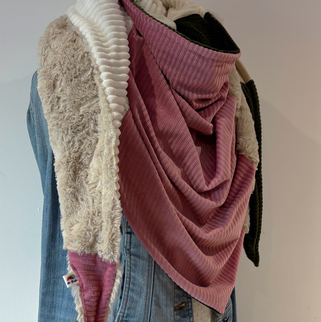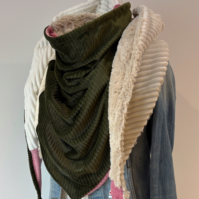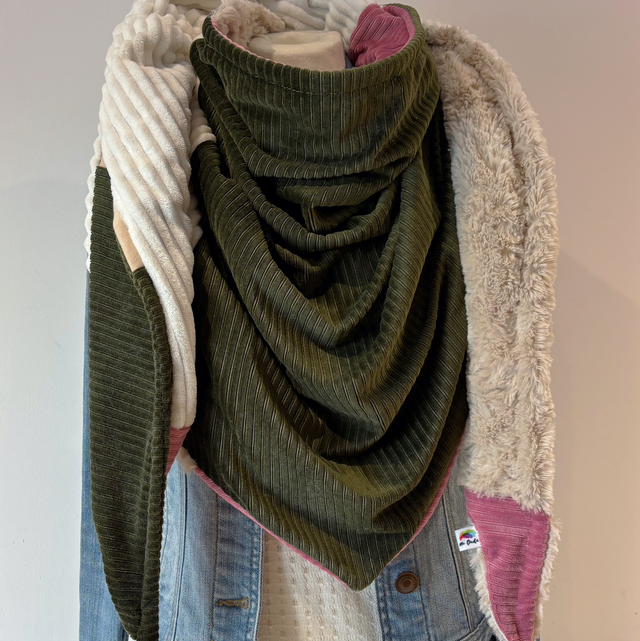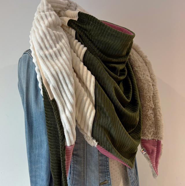 La maxi chèche est réversible et peut se porter de différentes façons.