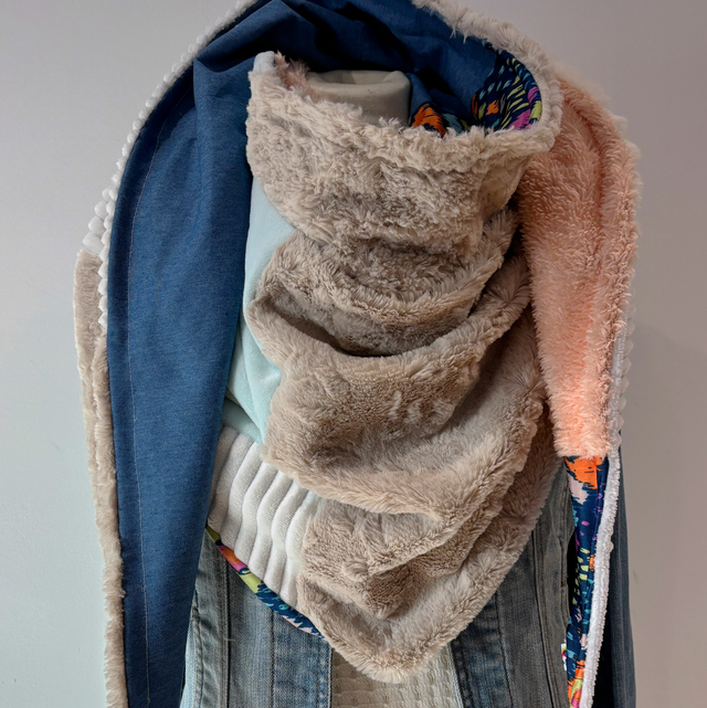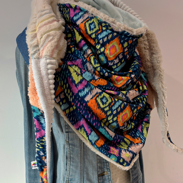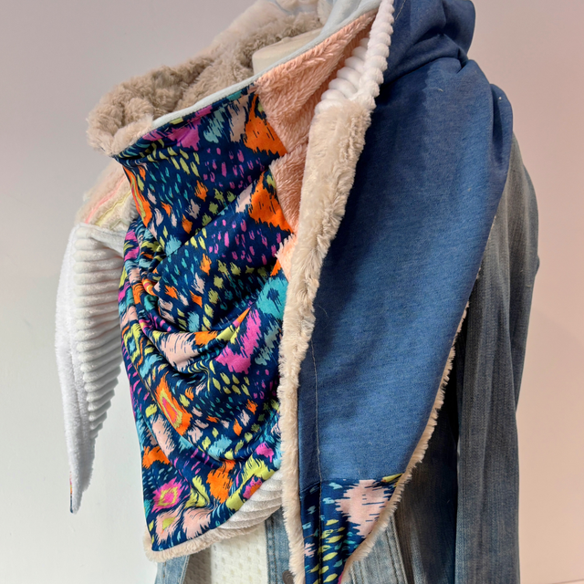 La maxi chèche est réversible et peut se porter de différentes façons.