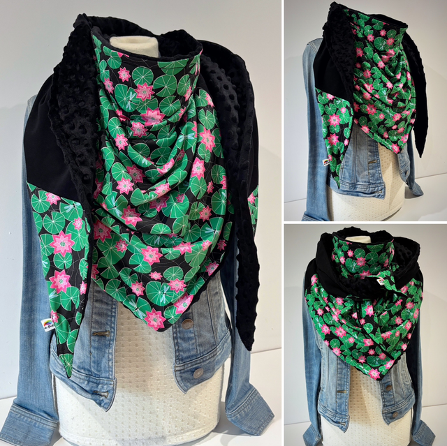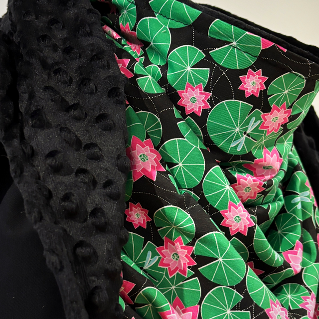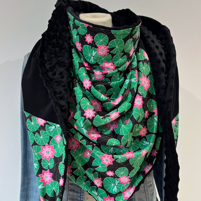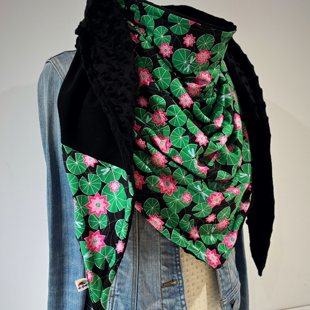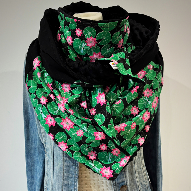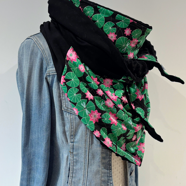 Maxi chèche avec un magnifique tissu avec des nénuphars verts et des fleurs rose sur fond noire en matière sweat et un tissu sweat noir