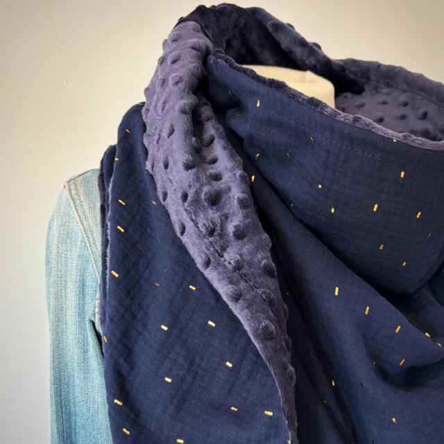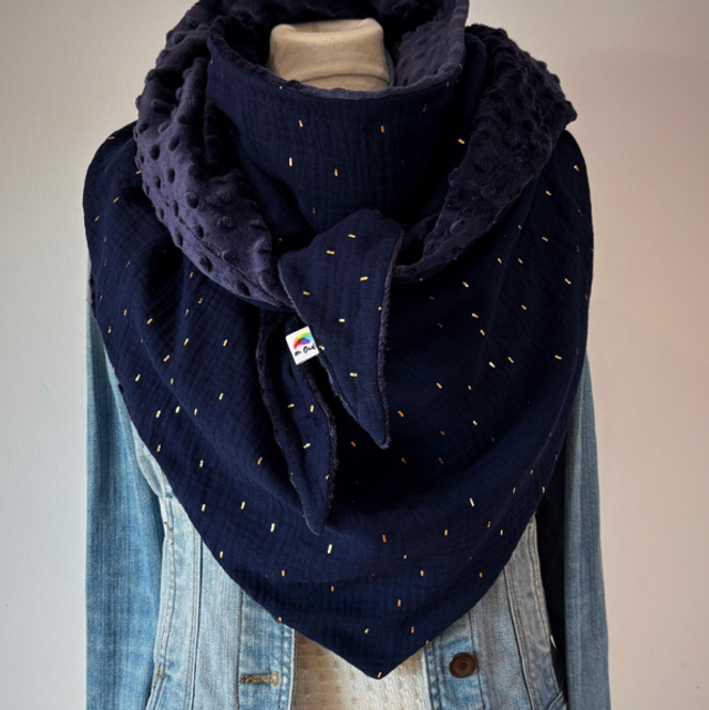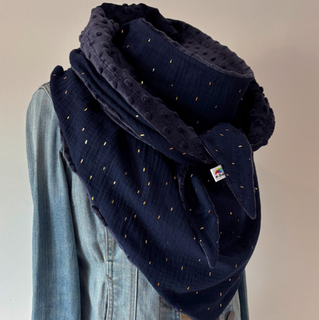 Maxi chèche avec un magnifique tissu noire en double gaze de coton avec des confettis dorés doublée en polaire minky noire.