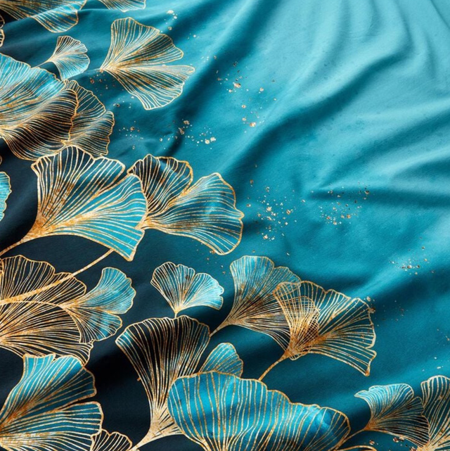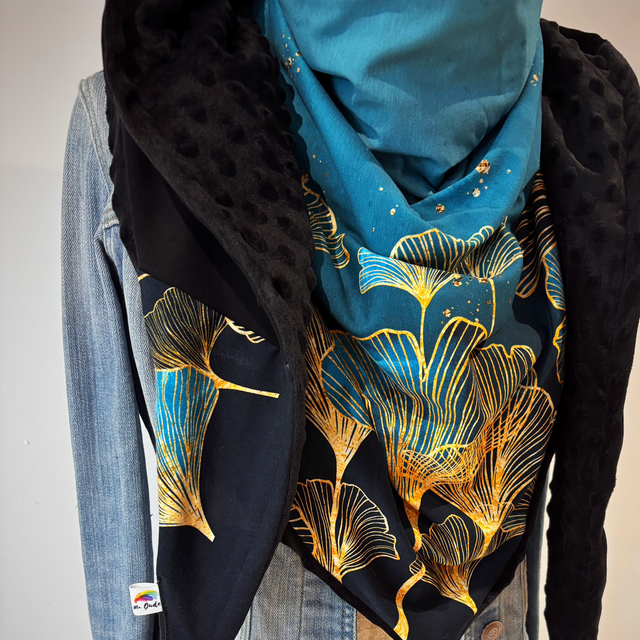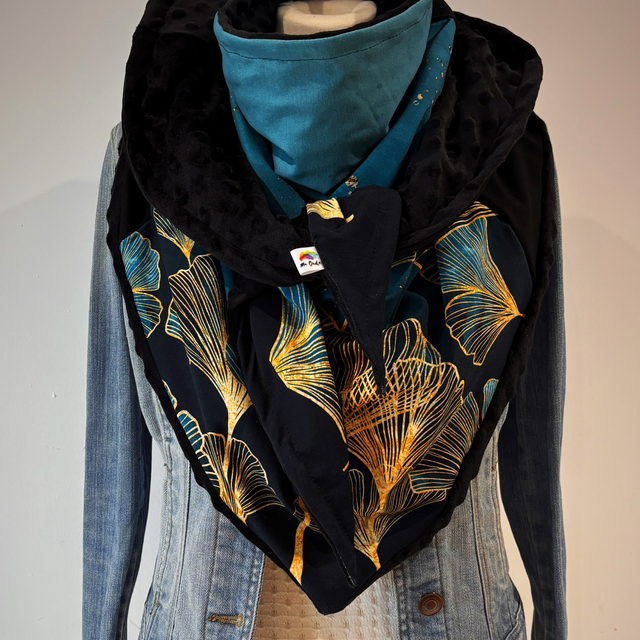 • Un jersey de coton imprimé de feuilles de ginkgo biloba dorées sur fond bleu et un tissu sweat noir