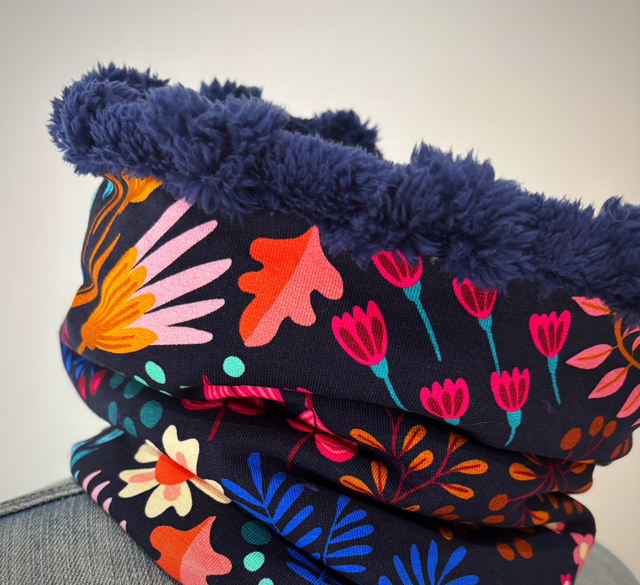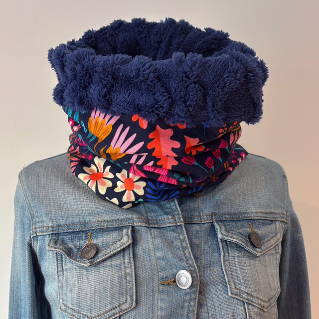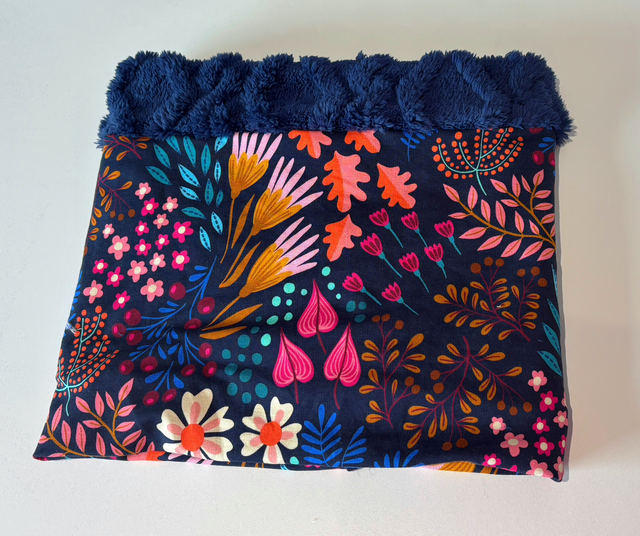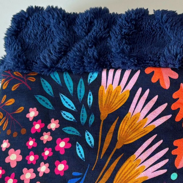 Avec d'un côté un magnifique tissu en coton BIO de très grande qualité et de l'autre côté une polaire torsadée bleu marine très gonflante, ultra douce et très chaude.