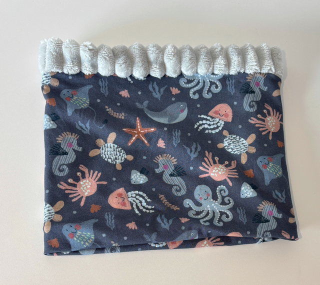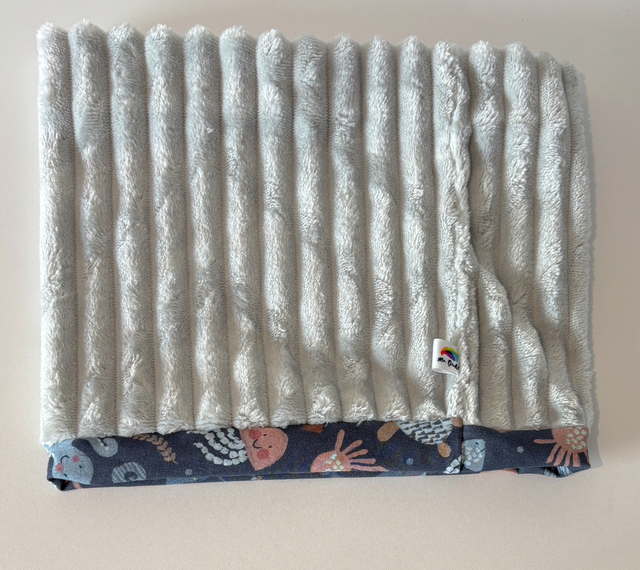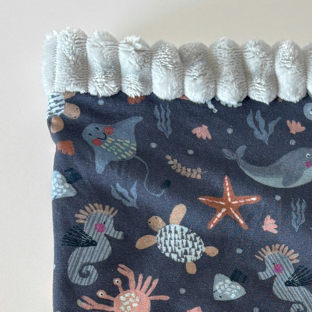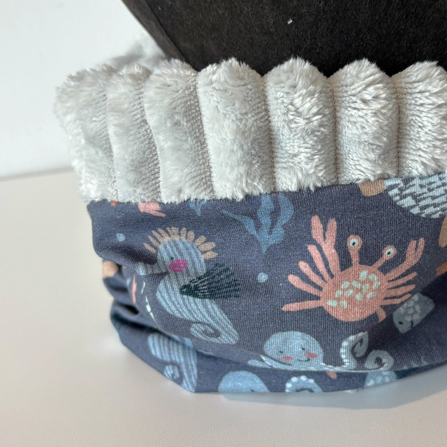 Avec d'un côté un magnifique tissu en tissu sweat thème mer bleu clair doublée en polaire côtelé grosses côtes gris clair