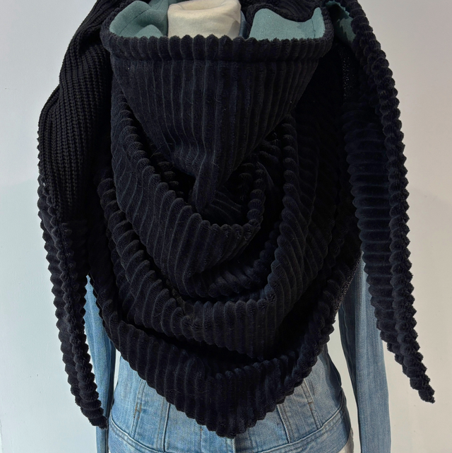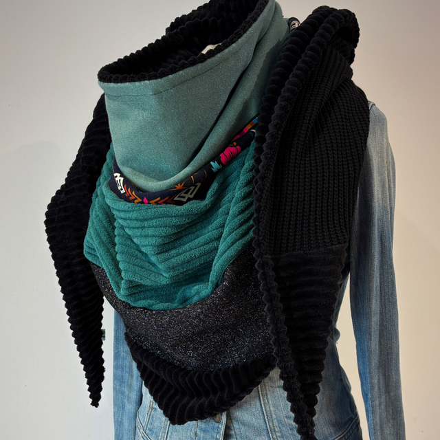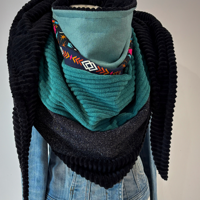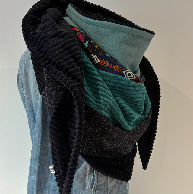 La maxi chèche est réversible et peut se porter de différentes façons.