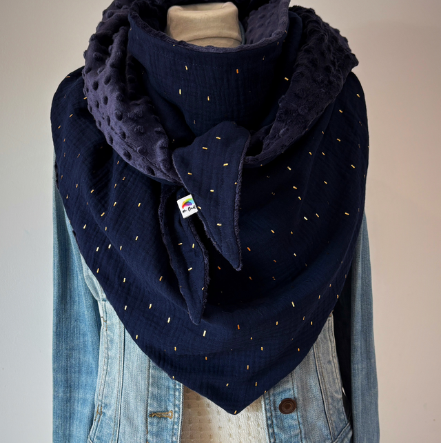Écharpe femme hiver – grande écharpe triangle chaude et douce – bleu marine et doré – accessoire cocooning chic