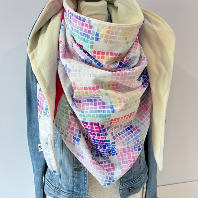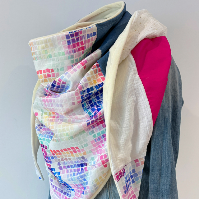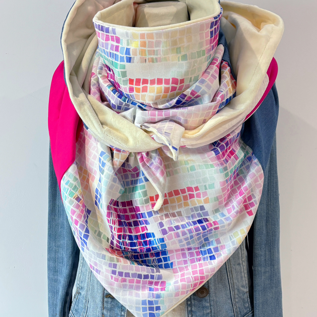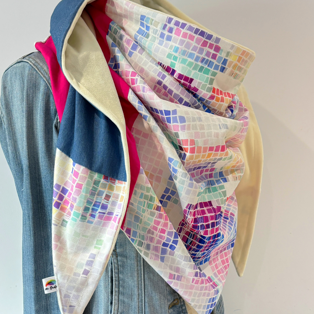 La maxi chèche est réversible et peut se porter de différentes façons.